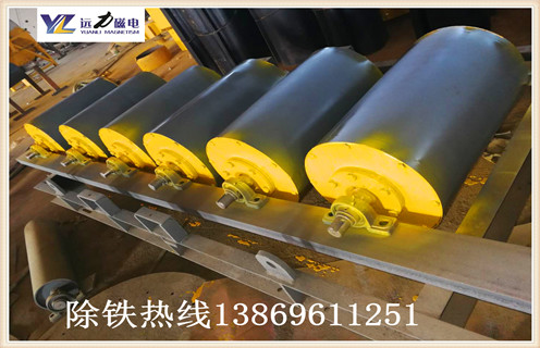 相當于把干式弱磁滾筒裝在皮帶運輸機上代替頭輪,或者說在皮帶機頭輪內(nèi)裝上磁系。磁系包角為360度。主要由:磁系、滾筒、磁軛、鋁環(huán)、皮帶組成。